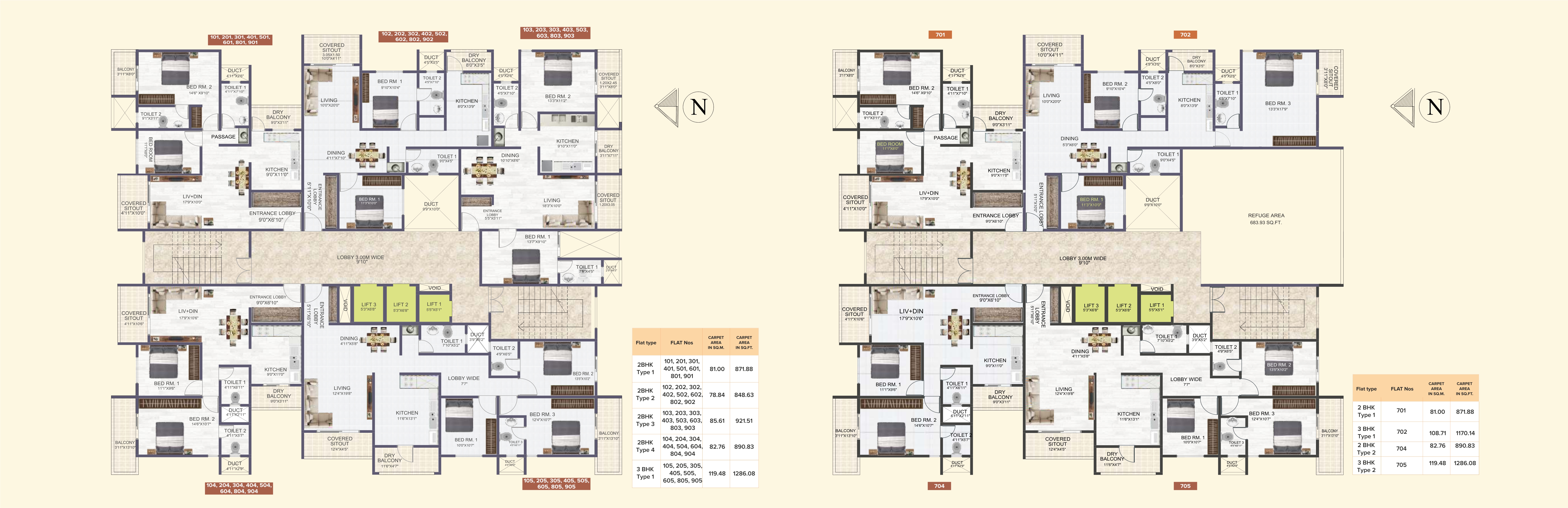 - 3BHK Luxurious Flat with carpet area ranging from 1170 Sq.Ft of 1290 Sq.Ft.